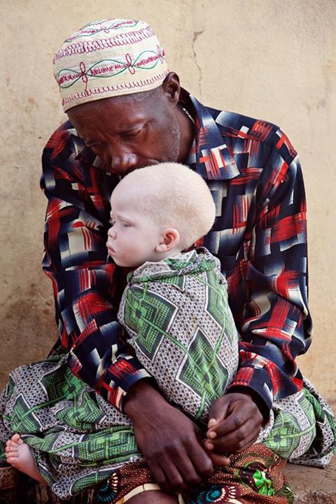 This man is holding an Albino child